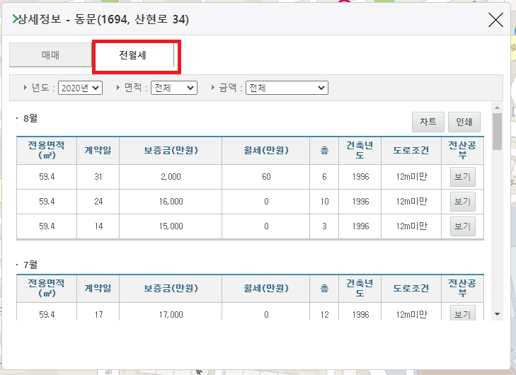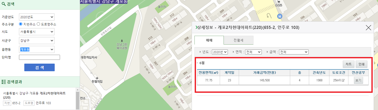 왼쪽에 기준년도, 주소입력 등이 나옵니다. 부동산 실거래가 조회를 원하는 곳의 정보를 입력한 뒤 검색을 해줍니다.